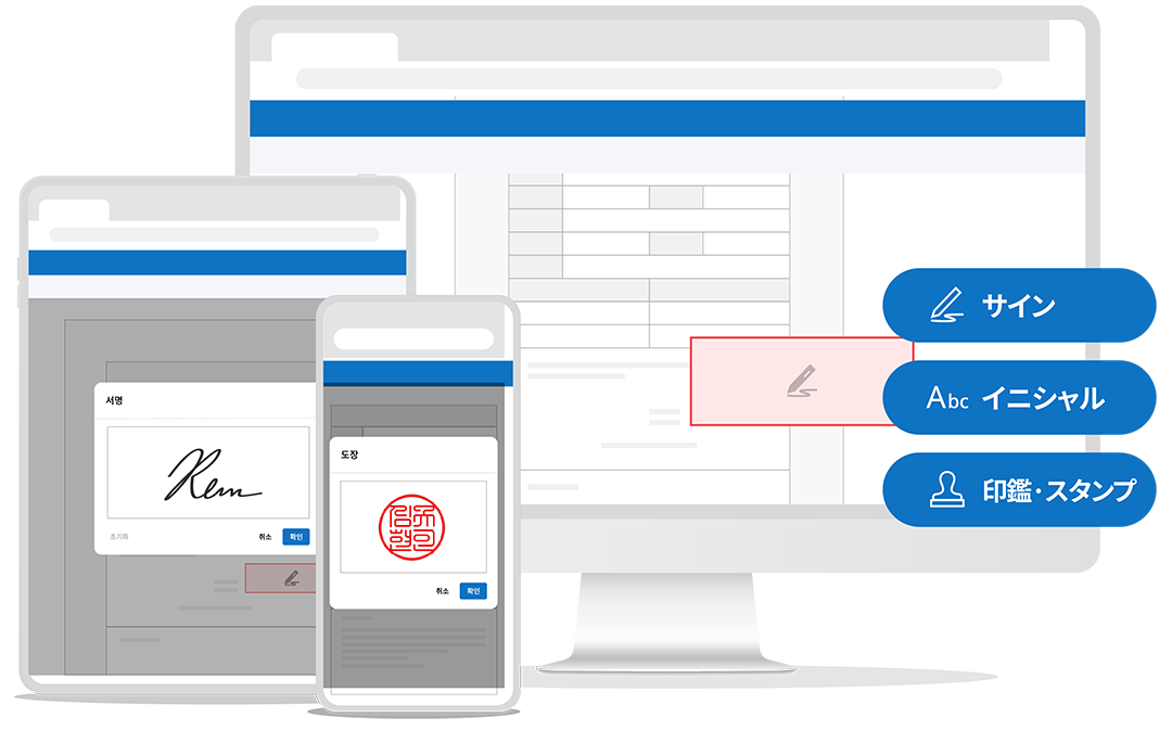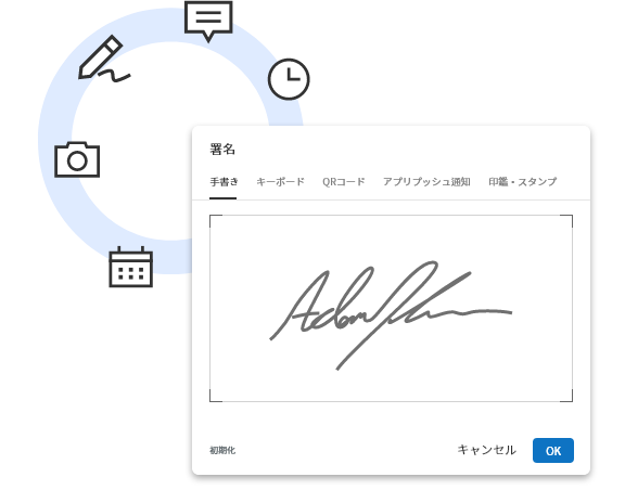 時間・場所を問わずPC、携帯端末(スマートフォン、タブレットなど)ですぐに署名することができます。契約書、申込書など、様々な文書にお使いいただけます。署名の方法は指・タッチペンによる手書き署名、テキスト入力、電子印鑑の中からお選びいただけます。